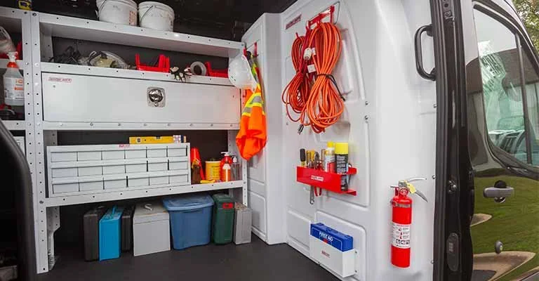 Cabinets and drawers in a commercial work van create secure, dedicated storage for tools, parts, and equipment, keeping everything neatly organized and easy to find. They help reduce downtime, improve productivity, and maintain a clean, professional workspace while on the job.